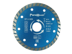 Алмазные диски для широкого спектра действия. Применяются для сухого реза кирпича, бетона, натурального и искусственного камня. Способны разрезать тонкую арматуру в бетоне. Высокая скорость резания. 30% алмазной крошки в составе связки. Высота сегмента - 7 мм. Посадка 22,2 мм. Переходное кольцо в комплекте. Сухой рез. Охлаждение водой увеличивает ресурс диска.