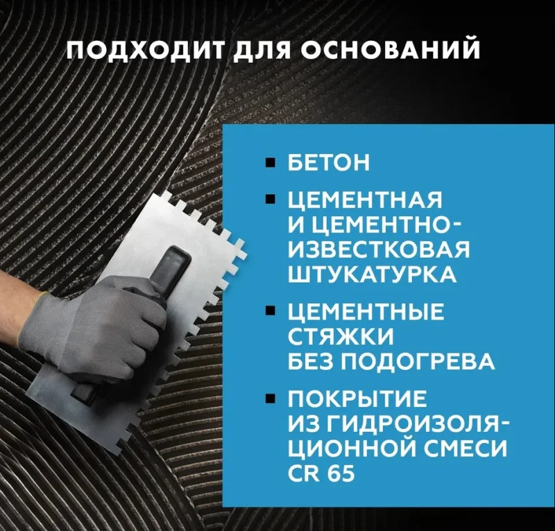 • пригоден для крепления керамогранитной плитки на полах без подогрева внутри зданий;