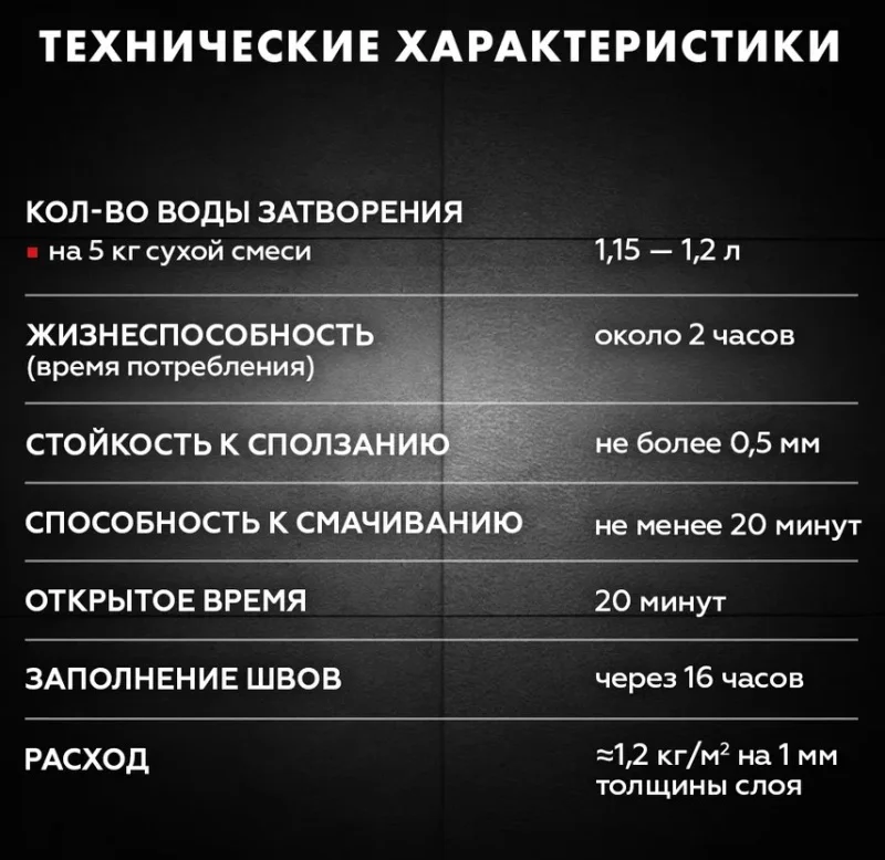 Пригоден для крепления керамогранитных плиток с водопоглощением < 3% на полах без подогрева, отвечающих требованиям СНиП 2.03.13-88, в помещениях с невысокими механическими нагрузками (жилых, административных и т.п.).