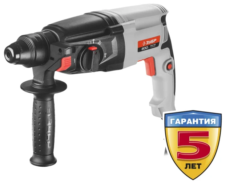 Модель перфоратора Зубр Мастер П-26-800 отличается наличием трёх рабочих режимов: обычное сверление, сверление с ударной функцией и долбление. Кроме того, инструмент позволяет поворачивать долото на установленный угол после каждого удара. Переключение режимов осуществляется при помощи бокового тумблера на корпусе. Для повышения удобства при продолжительной работе предусмотрен фиксатор кнопки «пуск», что освобождает пользователя от необходимости постоянно удерживать её.