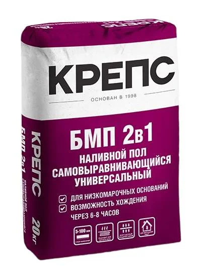 КРЕПС БМП 2в1 – ровнитель самовыравнивающийся. Высокомодифицированная сухая выравнивающая напольная смесь наливного типа на основе комплексного вяжущего и фракционированного песка. Обладает трещиностойкостью и быстрым набором прочности.
